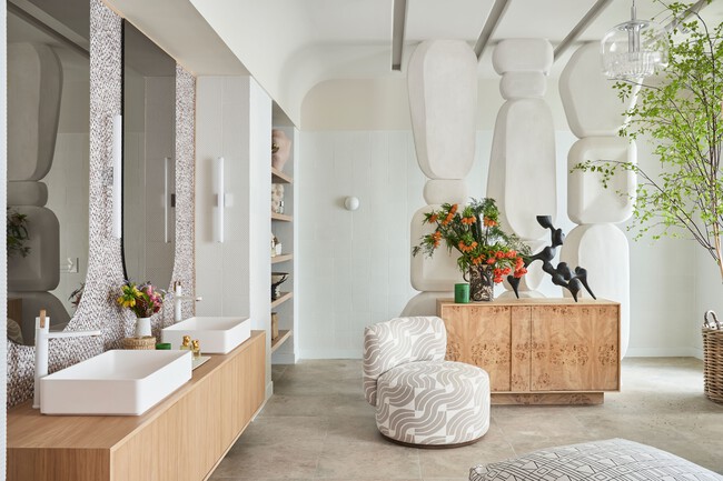 Las formas orgánicas y redondeadas son tendencia. Y en este baño que Guille García Hoz ha diseñado para Jacob Delafon se ve claramente. En el espacio se combinan materiales nobles y artesanales trabajados a mano, con griferías clásicas, suelos de mármol, con tonos neutros y tierra en paredes y techos revestidos con mortero de arcilla de Ecoclay.
