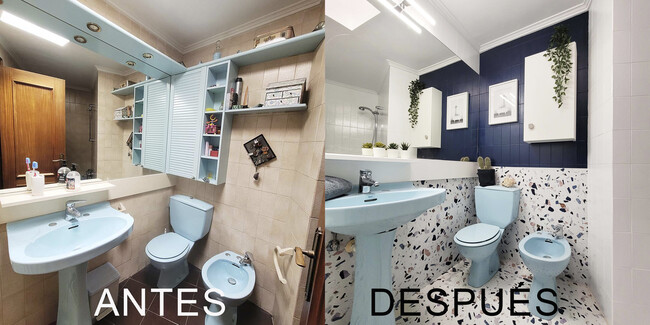 La reforma sin obras de este cuarto de baño saca a relucir el potencial de sus sanitarios. Unos sanitarios color azul que datan, según alcanza mi memoria, de los años 80. Y es que tienes que haber vivido esta época para saber que sí. Que los inodoros, lavabos e incluso los bidés pueden adoptar colores distintos al blanco.