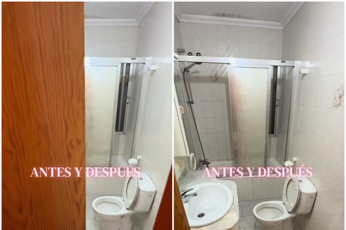En la imagen del “antes” se aprecia un baño típico de finales del siglo pasado: sanitarios clásicos, una mampara corredera de aluminio, azulejos blancos con motivos florales y una iluminación que no favorecía en absoluto la sensación de amplitud. El conjunto transmitía frialdad y cierta sensación de saturación visual, algo habitual en estancias pequeñas con materiales desactualizados.