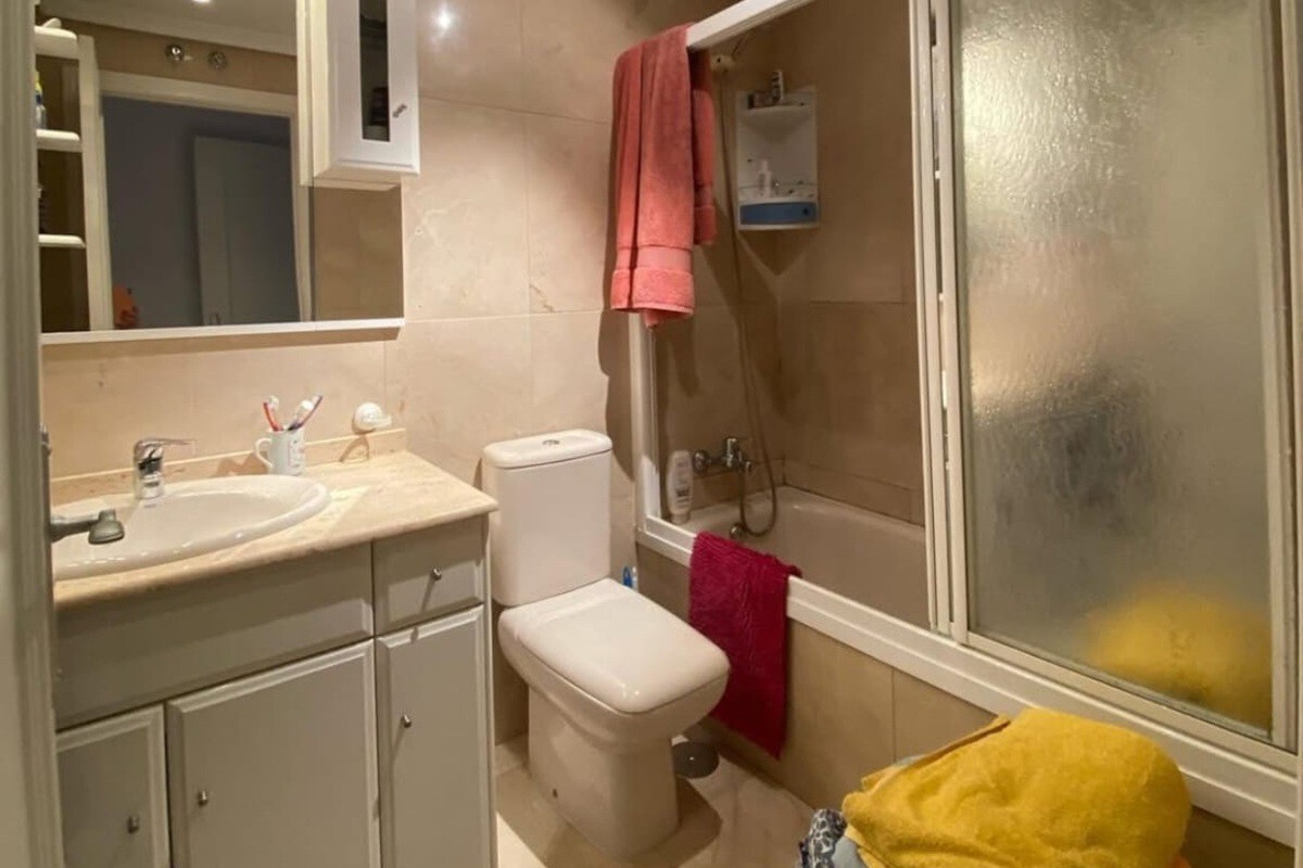 Sobre él, un espejo con armario superior completaba una estética más práctica que decorativa. La bañera, protegida por una mampara de aluminio blanco y cristal traslúcido, restaba ligereza visual y hacía que el baño pareciera todavía más estrecho. En definitiva, el conjunto daba una sensación de plano, sin interés visual ni alma.