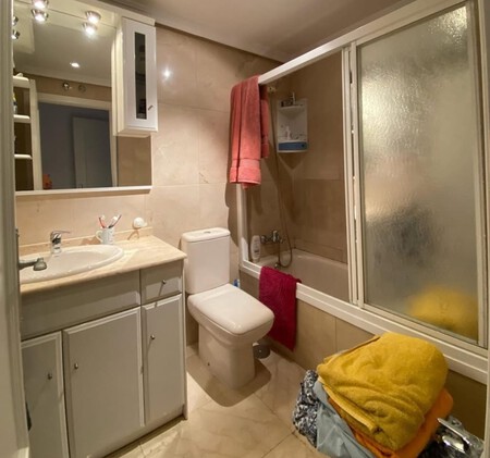 Sobre él, un espejo con armario superior completaba una estética más práctica que decorativa. La bañera, protegida por una mampara de aluminio blanco y cristal traslúcido, restaba ligereza visual y hacía que el baño pareciera todavía más estrecho. En definitiva, el conjunto daba una sensación de plano, sin interés visual ni alma.
