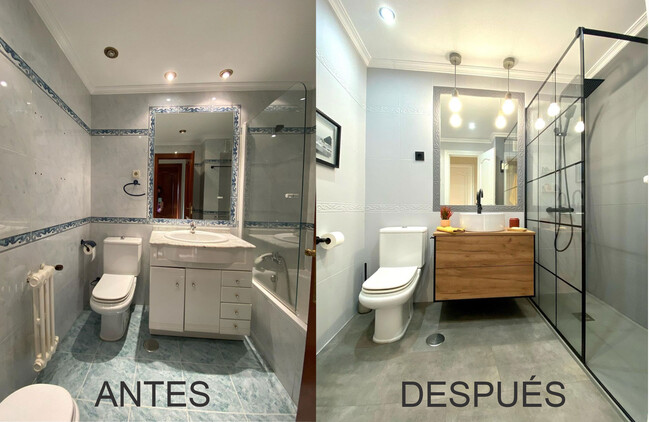 Se han mantenido el cuarto de baño de cuatro piezas, sin prescindir del bidé como viene siendo habitual. De hecho el inodoro y el bide son los mismos que antes de la reforma pero el "lavabo top ventas de los 90", se ha sustituido por un lavabo recto de acabado madera natural con lavabo sobreencimera. Además, donde antes estaba la bañera ahora luce una bonita ducha que parece de mayor tamaño gracias al suelo continuo del baño, ya que el color del plato de ducha es igual al acabado del nuevo suelo.