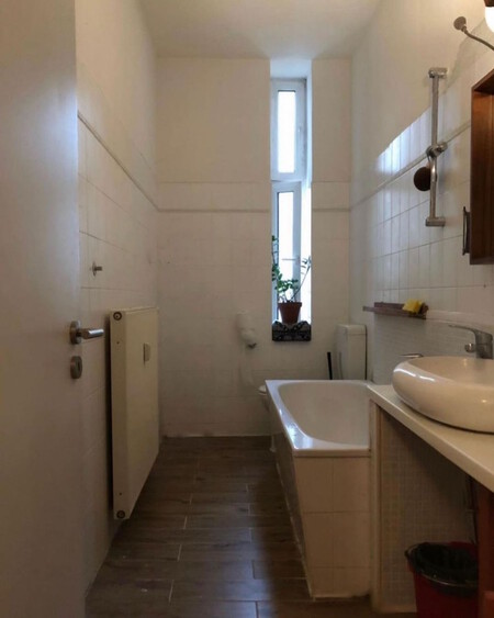 El aseo de este artículo tiene escaso potencial, un techo alto y una pequeña ventana que proporciona algo de luz, pero por lo demás es estrecho y alargado y tiene una distribución de lavabo, bañera e inodoro en línea que a priori no facilita mucho su renovación.