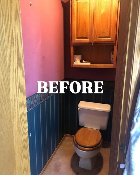 Era un baño pequeño, oscuro y sin nada de atractivo. Pero este es el claro ejemplo de que, aunque sea pequeño, también puede ser un foco de luz y atracción. El papel pintado azul mar con la combinación de una pintura granate por las paredes, muebles oscuros de color madera ,y un suelo en tonos tierra no ayuda a avivar la presencia de este rincón.