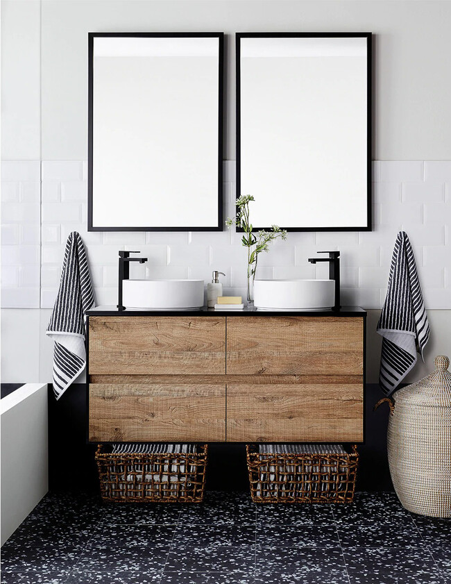 Los lavabos ahora se llevan rectos, encastrados sobre muebles con cajones o sobre encimera, que aunque puede resultar menos práctico (ya sabéis, por aquello de la limpieza de los bordes) es la opción más estética. Más aún si los acompañamos de grifería murales.
