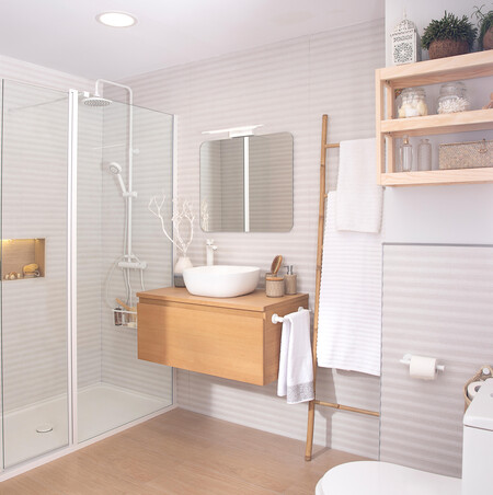 Sobre esta base, se introducen pequeños acentos en negro en griferías, marcos o accesorios o en tonos naturales que aportan contraste sin romper la armonía. Esta estrategia permite actualizar el espacio fácilmente sin necesidad de grandes cambios.