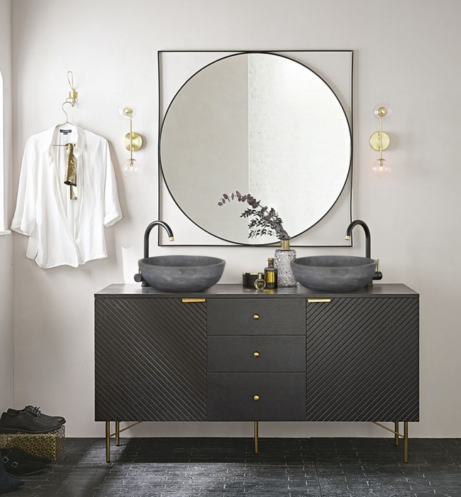 Finalizamos la selección con el modelo de mueble para lavabo Jagger de Maisons du Monde de aires retro y muy elegante incluye dos lavabos con 2 puertas y 3 cajones y se eleva sobre una finas patas de latón.