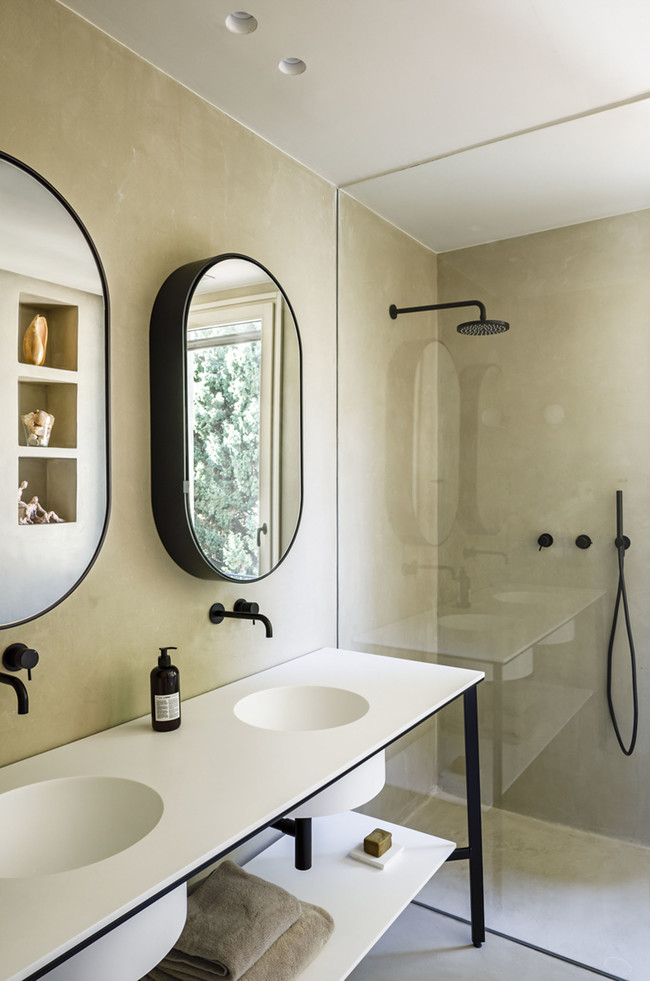 Para los revestimientos en las paredes este año hemos visto que las opciones no se limitan a los azulejos. Los microcementos, algunos tipos de pintura e incluso los paneles vinílicos nos permiten hoy en día lucir paramentos continuos en los cuartos de baño.