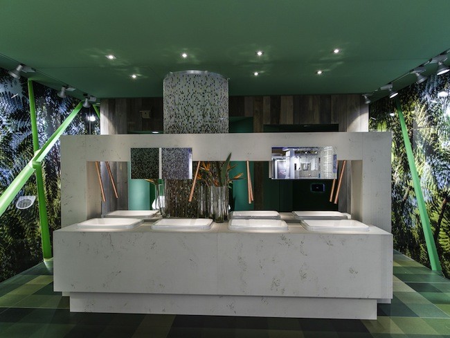 El baño-jungla, ISH 2015. En la feria ISH 2015, Villeroy & Boch presentó su baño-jungla, en la primera foto de este artículo y en la foto sobre estas líneas. Muy original e inspirador para diseñadores y arquitectos a la hora de concebir los más extravagantes diseños de cuartos de baño.