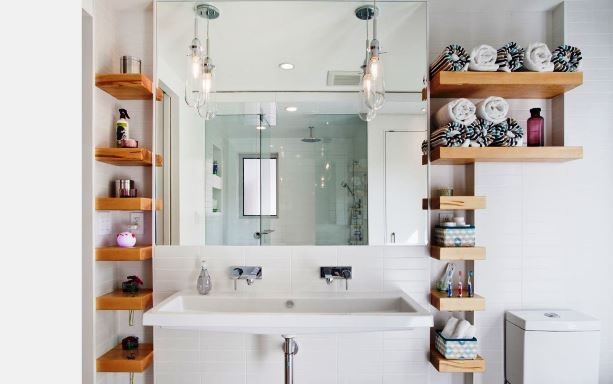Esta idea nos encanta. Los estantes se utilizan para arropar el lavabo y forman un conjunto cómodo y práctico. Además de su simetría ideal.