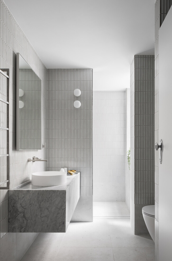 Se puede escoger también el gris, en distintos revestimientos. Así la neutralidad y tranquilidad están aseguradas y puedes escoger hasta dos revestimientos de tendencia. Como el suelo y la encimera de acabado piedra natural y el los azulejos rectangulares con disposición en vertical de la siguiente imagen. Te aseguras así que el baño se vea muy actual, a pesar de su neutralidad.
