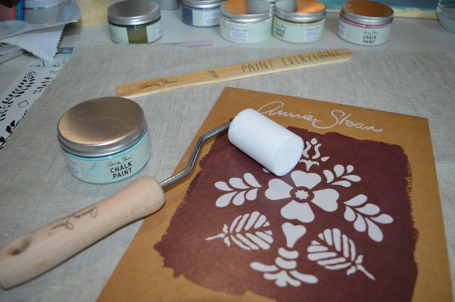 Así que tras hacernos una prueba en la que María pintó una antigua silla, con tapicería incluida, los asistente al taller nos pusimos manos a la obra y pudimos pintar una tela de lino. Una vez elegida una de las plantillas de Annie Sloan con la que realizar las estampaciones y un par de colores, nos pusimos manos a la obra.