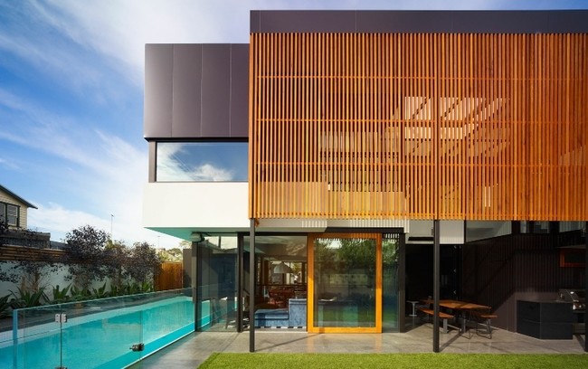 Con este diseño futurista cerramos estas exposiciones. La casa tiene detalles muy especiales, puede que sea una casa de verano por su color blanco combinado con madera. Consta de grandes terrazas que casi todas tienen como vista las zonas comunes y la piscina. Otro detalle que agrada es el techado del comedor exterior realizado con mucha creatividad, busca la sombra sin necesidad de añadir toldos u otro tipo de dispositivo para resguardar esta zona. Para mayor comodidad existe una zona de jardín con césped el cual está desvinculado de la piscina. Mientras la zona de agua tiene un suelo revestido y artificial que la rodea haciendo más práctico y limpio el asceso de la zona exterior a la interior.