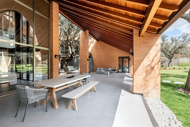 Los materiales nobles protagonistas en la construcción como acero, cristal, madera de Iroco e Ipe, ladrillo y hierro dotan a la vivienda de una elegancia sobria y duradera. La casa se articula alrededor de un gran patio central coronado por una encina centenaria, lo que permite una distribución fluida de los espacios y una luminosidad que invade cada rincón a través de los grandes ventanales.