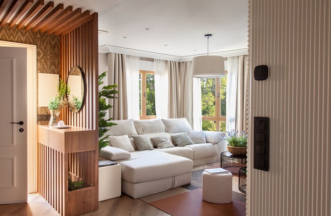 El acceso a la vivienda ya nos señala que se ha cuidado especialmente el diseño en esta casa. La entrada conecta directamente con el salón, y para salvaguardar la intimidad familiar, desde el estudio de interiorismo se diseñó una original pieza en forma de cubo revestido de listones de madera de nogal que evita la visión directa al interior de la casa. Dicha pieza, hecha ex profeso para el proyecto, integra también un mueble tipo consola creando así la atmósfera de un pequeño y práctico recibidor, antes inexistente.