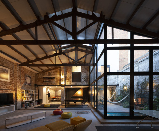 El espacio central se ilumina y ventila a traves de un patio que crearon los arquitectos con la eliminación de una parte de la cubierta de la nave original. El patio se vive como una extension del espacio principal.
