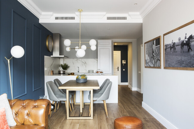 El resultado son unas viviendas de líneas muy elegantes con un estilo neutro a caballo entre cierto clasicismo (en las molduras), algunos guiños art déco (con lámparas redondas doradas) y detalles contemporáneos como los que aportan los mármoles (en baños y cocina) y las maderas de nogal y lacadas del mobiliario. Precisamente lo que se pretende precisamente es "no tener un estilo definido para poder adecuarse a cualquier tipo de huésped, poniendo el foco en crear unas estancias privadas de máxima amplitud visual y con una estética muy cuidada", en palabras de la interiorista catalana.