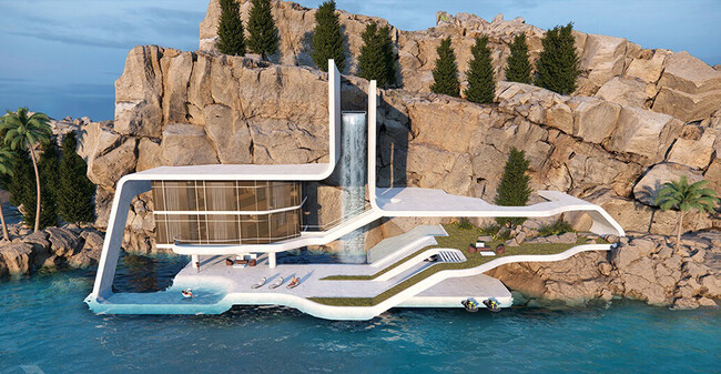 Como en la dirección de la cascada, todo en esta casa te dirige hacia la planta baja en la que una gran plataforma te conecta con el mar. Además de la "infinity pool" o piscina infinita, se incluye un embarcadero y una gran terraza para disfrutar del exterior tanto como del interior. La planta baja es la que si incluye la zona de día y los dormitorios se reservan en las plantas superiores con vistas frontales al mediterráneo. Una casa diseñada para conectar y disfrutar de la naturaleza en su estado puro.