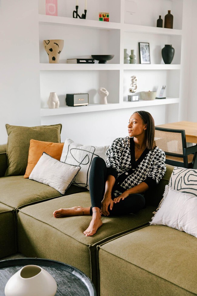 Según reconoce Ana, el gran sofá verde oliva es una de las piezas claves del espacio, y una de las que más admiración suscita por su diseño y comodidad.