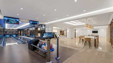 Tampoco falta un salón con billar, un bar, una sala de cine para veintidós personas o una bolera doble profesional. En el exterior, además de 500 metros cuadrados de terraza, hay una piscina de 22 metros que según afirma la inmobiliaria, "se funde con el horizonte".