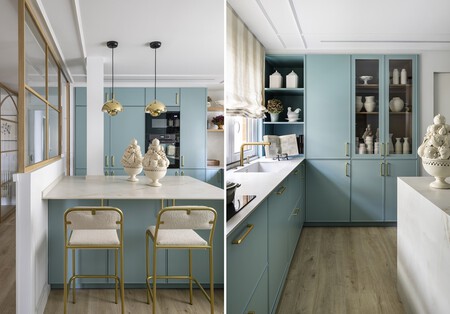 Como decíamos al principio, mover la cocina de un extremo al centro de la vivienda fue la clave de esta reforma integral. En su diseño, destaca el uso del color y la mezcla de papeles pintados y textiles. En concreto, se apostó por un sofisticado verde azulado empolvado para los muebles lacados de la cocina. Este color ha sido el hilo conductor que ha marcado la decoración a lo largo del resto de la vivienda.