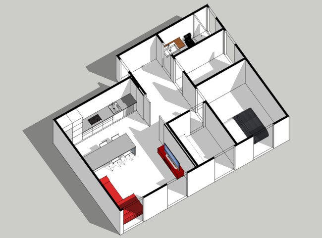 La idea es mantener el baño que es lo único que los anteriores propietarios reformaron, y también queremos mantener la ubicación de la cocina, si bien queremos dejarla abierta a la sala y separar los espacios mediante una barra o isla o algo similar... El problema que tenemos es que mi pareja tiene dos hijos y a pesar de que el piso tiene pocos metros necesitamos tres habitaciones, una de matrimonio y dos para los chavales (de 13 y 17 años, chico y chica). El uso que le darán ellos no es diario puesto que no viven con nosotros, sólo vienen dos fines de semana al mes y la mitad de las vacaciones escolares.
