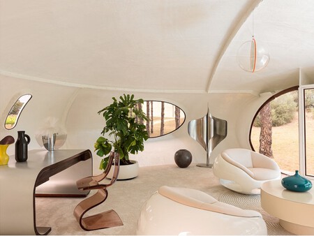 La Casa Xasteros no es una vivienda cualquiera: su estética futurista, que recuerda a un platillo volante, y su estructura de fibra de vidrio la convierten en una cápsula del tiempo de la arquitectura de finales de los 60. En tan solo 45 metros cuadrados, incluye salón, cocina, dormitorio y cuarto de baño, todo ello en un espacio compacto, ligero y sorprendentemente funcional.