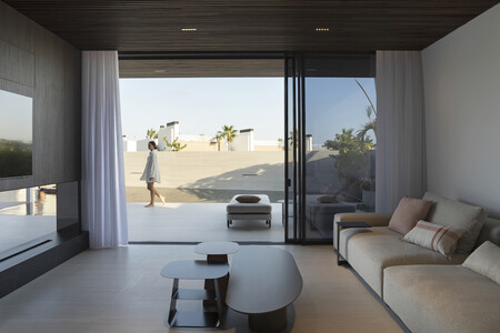 La planta superior, con una suite principal y un segundo dormitorio polivalente, se vuelca a la terraza descubierta. Por su emplazamiento, la residencia requiere de grandes voladizos y celosías en las zonas exteriores que sirvan de protección solar.