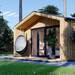 Las paredes, compuestas por paneles sándwich de lana de roca, garantizan un aislamiento térmico y acústico sobresaliente. El techo de dos aguas añade un precioso toque arquitectónico al diseño de la cabaña. Además, presta una encantadora terraza de 5.50 metros cuadrados para descansar cómodamente al aire libre.