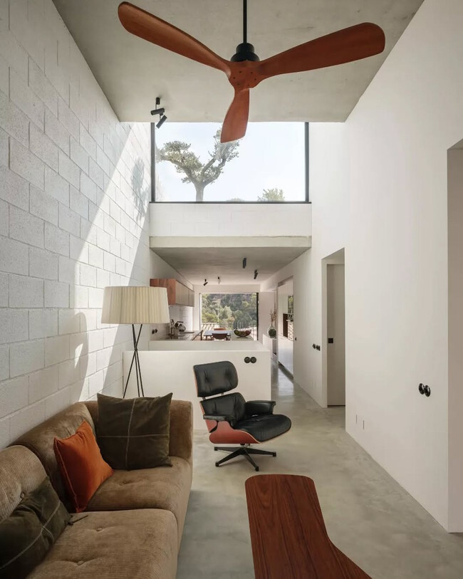 En un lateral del edificio se concentran las escaleras, el ascensor, los baños y rincones de almacenamiento. El resto del espacio queda destinado a vivienda y garaje. En cuanto a la iluminación natural destaca al lucernario en la cubierta que hace que la luz atraviese verticalmente la vivienda. La casa cuenta también con un pequeño patio con acceso directo a la planta principal.