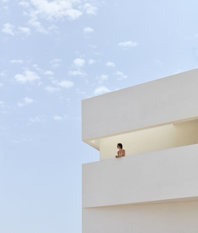 Balzar Arquitectos y Julia Alcocer firman este proyecto en Torrevieja que parece una blanca fortaleza en su exterior, pero se abre a un impresionante patio y a las fascinantes vistas en rosa claro de unas salinas cercanas.