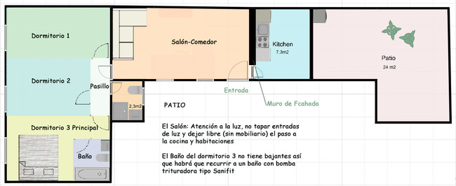 Lo cierto es que, aunque nos hemos decidido por está opción, hay muchos detalles que se nos escapan. ¿Hay luz en el patio? Porque si el patio es luminoso no le vemos inconveniente a esta distribución, pero si no entra nada de luz quizá no sea una buena opción.