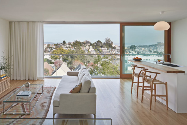 Empezando por la cocina-comedor, un espacio dominado por la imponente panorámica de las colinas de San Francisco, a su vez potenciada por la limpieza de la apertura. La sensación no sería la misma si en vez del enorme ventanal hubiera dos ventanas, aunque fueran muy grandes. Así la casa se adueña de la ciudad, y la ciudad de la casa, de manera que el espacio, además de cocina y salón, se vive también como terraza.