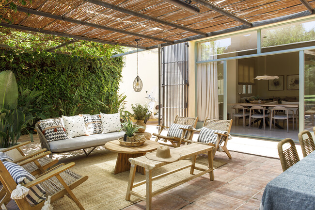 El porche al que se accede desde el comedor, cubierto bajo una pérgola de estructura metálica con mimbre, se ha distribuido en zona estar con un sofá y cuadro butacas, y comedor exterior con mesa para ocho comensales.
