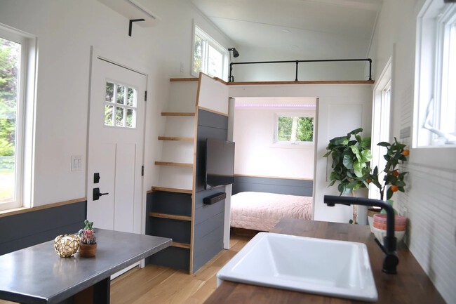 Por otro lado la casa monoceros es de 35 metros cuadrados y está construida sobre un remolque de tres ejes de 10x2,50 m, su precio actualmente es de 68.262,90 euros. La distribución en este caso es de 15 m² de la sala de estar de cocina americana, tres espacios de 5 m² que se pueden usar como dormitorios, uno abajo y dos arriba y 5 m² para el cuarto de baño. Las características exteriores de la vivienda son muy similares a las de la anterior, con la diferencia de que esta cuenta con solo un enchufe eléctrico exterior en la puerta delantera y no tiene porche.