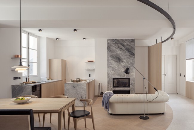 Las curvas definen el uso y la zonificación de este piso parisino transformándolo en un espacio diferente, al tiempo que mantiene la esencia y la tradición de la arquitectura de la zona en forma de molduras y techos altos.