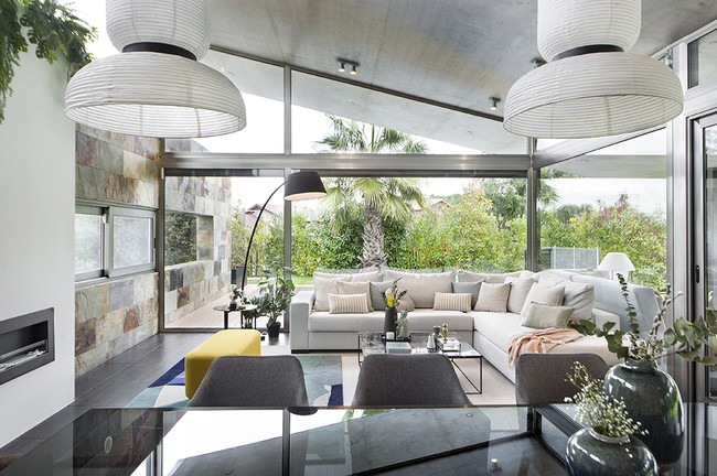 Bajo el forjado inclinado de hormigón se sitúan el salón y el comedor. Esta zona pública de casa se ubica junto a la piscina, y gracias a sus grandes ventanales ésta y el jardín sean parte integrante de su decoración. De hecho, en toda la estancia, solo hay una pared al uso que cuenta con un revestimiento de piedra, que se extiende hacia el exterior. El resto de las paredes se sustituyen por grandes ventanales.