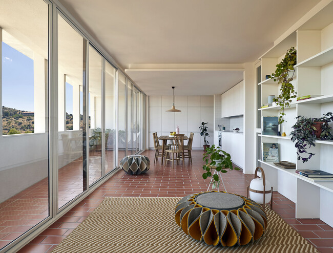En todo su interior, los materiales sencillos y tradicionales como el suelo de baldosa de terracota tradicional o baldosín catalán y el ladrillo de la celosía forman parte importante de la decoración y combinan con el escaso pero bien escogido mobiliario.