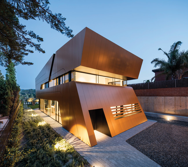 Empezamos el fin de semana con una singular vivienda en el Vallès Occidental, Barcelona, diseñada por ON-A Arquitectura y construida por la compañía especializada en construcción modular sostenible ARQUIMA. La original casa destaca, como podéis ver en las fotos, por su volumetría y acabados. Es una casa opaca hacia la calle, pero totalmente abierta y transparente en la parte frontal y los laterales.