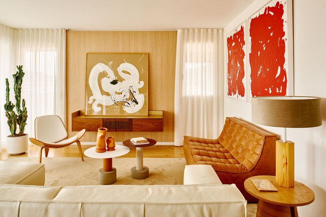 Entre los grandes ventanales, la pared frontal se ha panelado con madera de roble lo que contribuye a crear el efecto sesentero al conjunto. Sobre el aparador suspendido de Stockholm Slime (Punt Mobles) se apoya una obra pictórica del artista Iñaki Moreno. Uno de los modelos más icónicos del diseñador danés Hans J. Wegner, la silla Shell Chair CH07 tapizada en blanco se integra con su ligereza, también flotante, en esta vista.