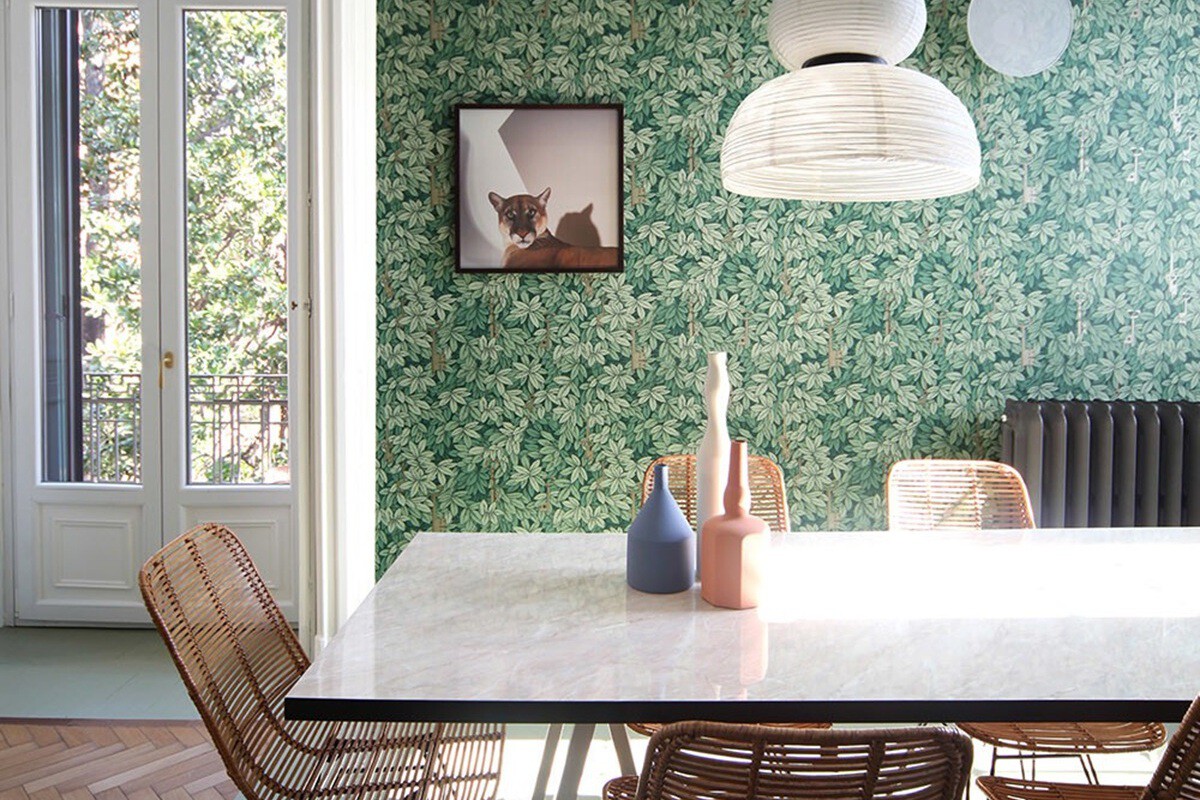 Elementos como la alfombra del salón, la tulipa de la lámpara o el papel pintado de inspiración William Morris (más propio de la casa de la abuela de tu abuela)— conviven con naturalidad en este apartamento milanés, donde las estancias se abren a un gran patio interior rebosante de vegetación.