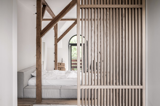 En el segundo piso hay un gran dormitorio con su propio baño y vestidor, un estudio, un gimnasio y un baño con zona de lavandería. En el espacioso dormitorio destacan las estructuras de vigas de madera que además de dividir y separar ambientes genera un bonito espacio visual con un interesante juego de luces y sombras.