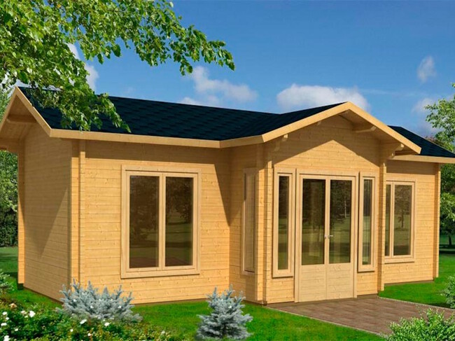 Este bungalow de nombre Anna tiene una superficie de 26,8 metros cuadrados está fabricado de madera de abeto nórdico de alta calidad con un acabado en las esquinas recto para mejorar la resistencia al viento y la lluvia. La madera está sin tratar para que se pueda personalizar con acabado de cualquier color en el momento que se monte. Como ya hemos comentado, este modelo, en particular, dispone de dos habitaciones, dormitorio y salón-cocina-comedor y un cuarto de baño, totalmente personalizables. Por su parte, el tejado se compone de unos travesaños tratados que sujetan toda la estructura y de tablas solidas machihembradas al igual que el suelo.