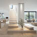 La conexión entre los espacios no se da sólo por la falta de paredes. Los tonos neutros y naturales de los textiles y mueble, y el suelo de madera de roble natural, dan coherencia y sensación de unidad a toda la casa.