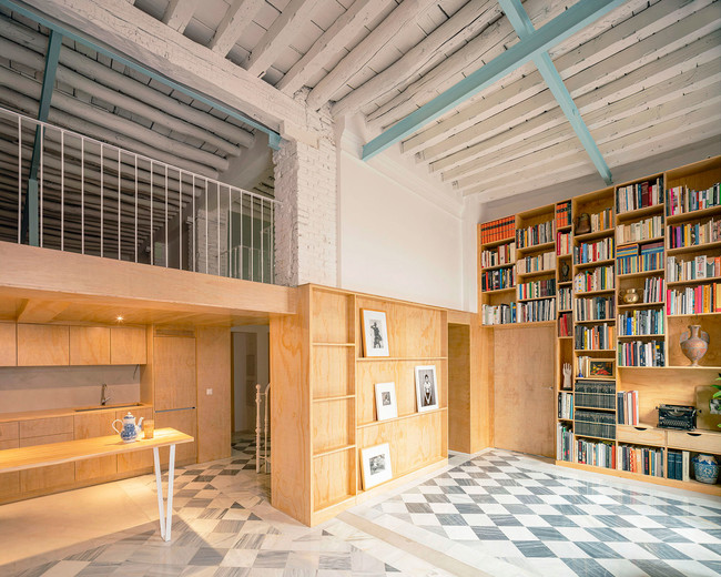 Una vivienda, que antes eran dos, y la necesidad de contar con una gran librería en un edificio histórico de Granada dan como resultado esta singular vivienda moderna, juvenil y funcional, en la que las capas dejan contemplar la historia de las sucesivas reformas.