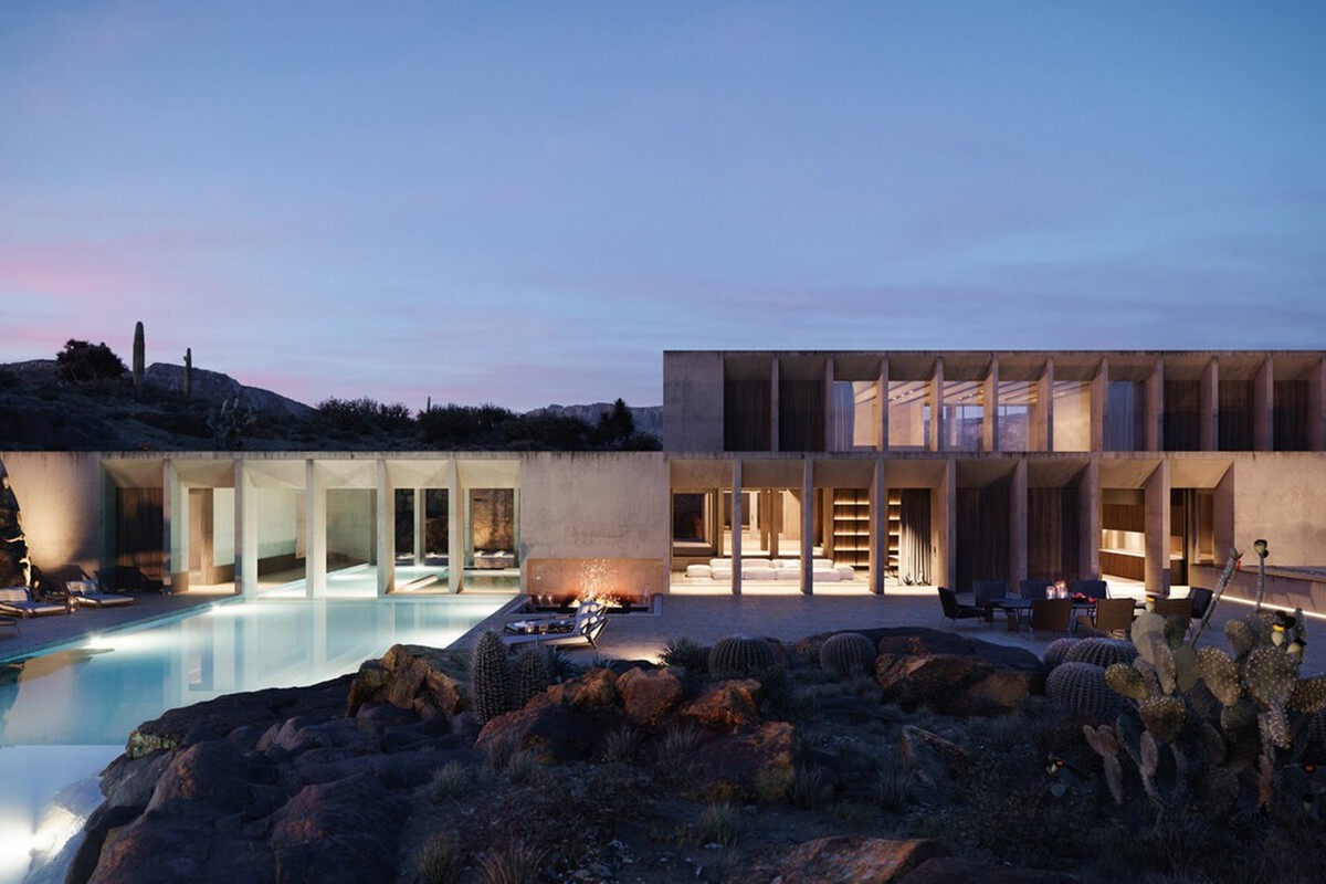 La Hunter House se sitúa en el desierto de Sonora, en Estados Unidos. El proyecto, firmado por Henry Goss Architects – Hunter House, fue concebido como un refugio de lujo sobrio capaz de alojar hasta cuatro parejas, con zonas de servicio independientes para garantizar la privacidad total de los huéspedes.