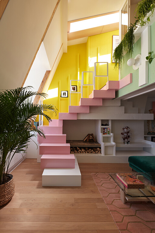 El rosa para la escalera se inspiró en el suelo de resina original del apartamento, un color con el que los propietarios estaban particularmente apegados, y el verde que se distribuye en numerosos detalles por el apartamento es una referencia directa a las plantas y la naturaleza.