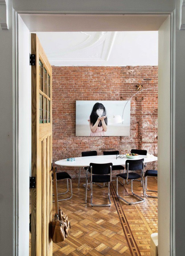 Las puertas y ventanas con sus cristales emplomados de colores o los muros de ladrillo visto conviven en armonía con las encimeras de la cocina abierta de hormigón pulido y los taburetes modernos que se ordenan en la barra, inspirada en un conocido café.