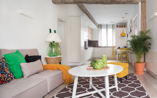 Pero hay dos originales elementos diseñados por Natalia Zubizarreta llaman especialmente la atención: la lámpara de techo, que combina diferentes pantallas de ratán de colores, y la lámpara situada sobre una mesilla de mimbre, fabricada con una antigua damajuana y una pantalla de algodón blanco. Además, desde el salón se accede a un pequeño balcón con suelo de baldosa hidráulica.