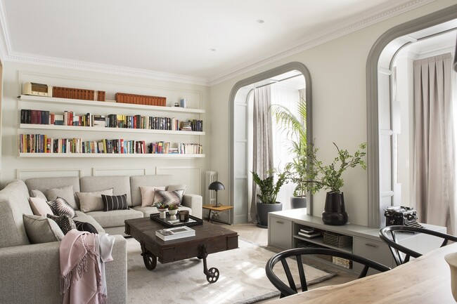 Para ampliar la zona de día de la vivienda, Pia Capdevila decidió integrar la antigua galería en el salón. “Nos encontramos un arco precioso en el salón que daba acceso a una galería con una ventana. Decidimos duplicar ese arco y crear una doble entrada de luz al salón”, comenta la interiorista.